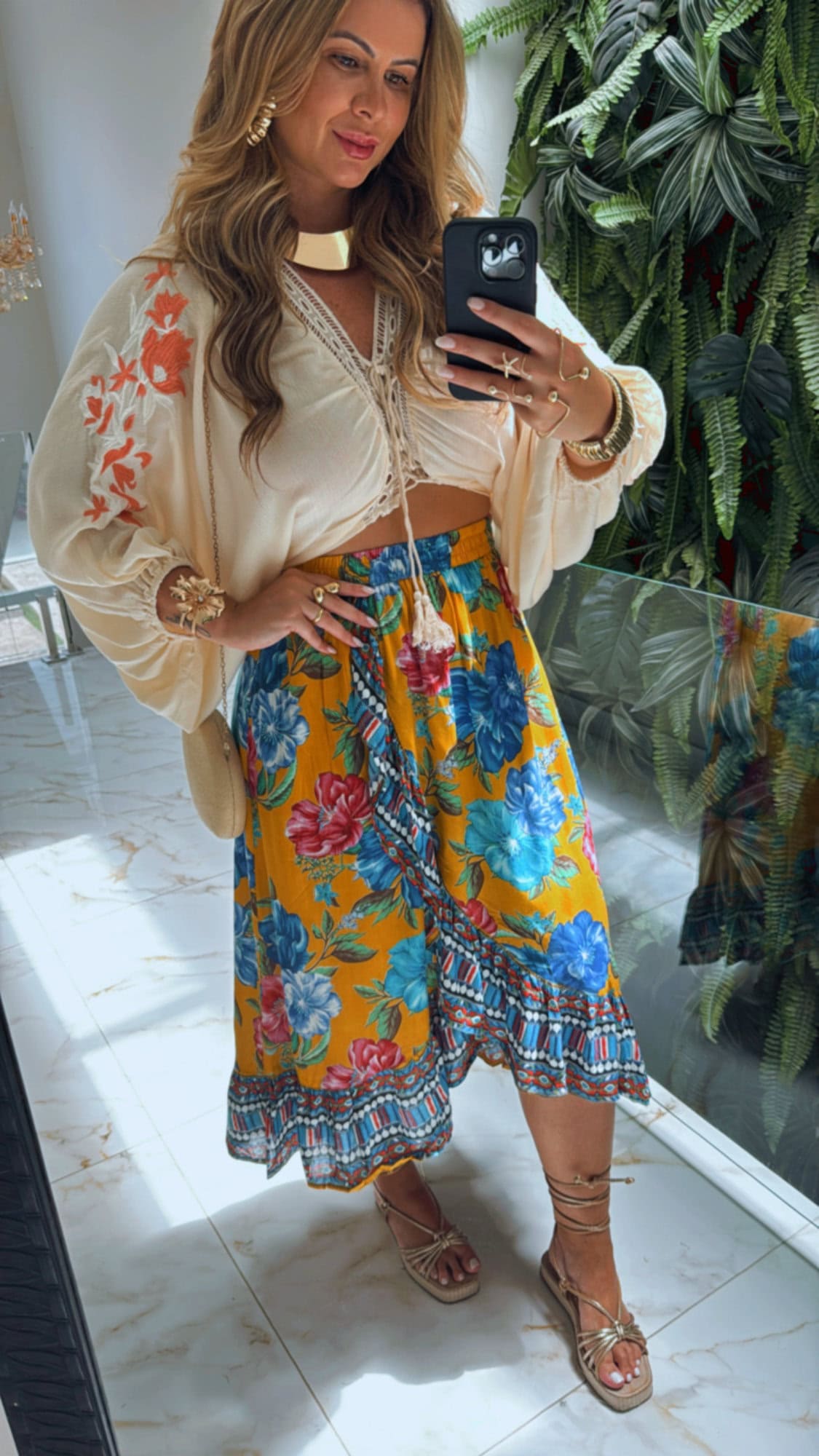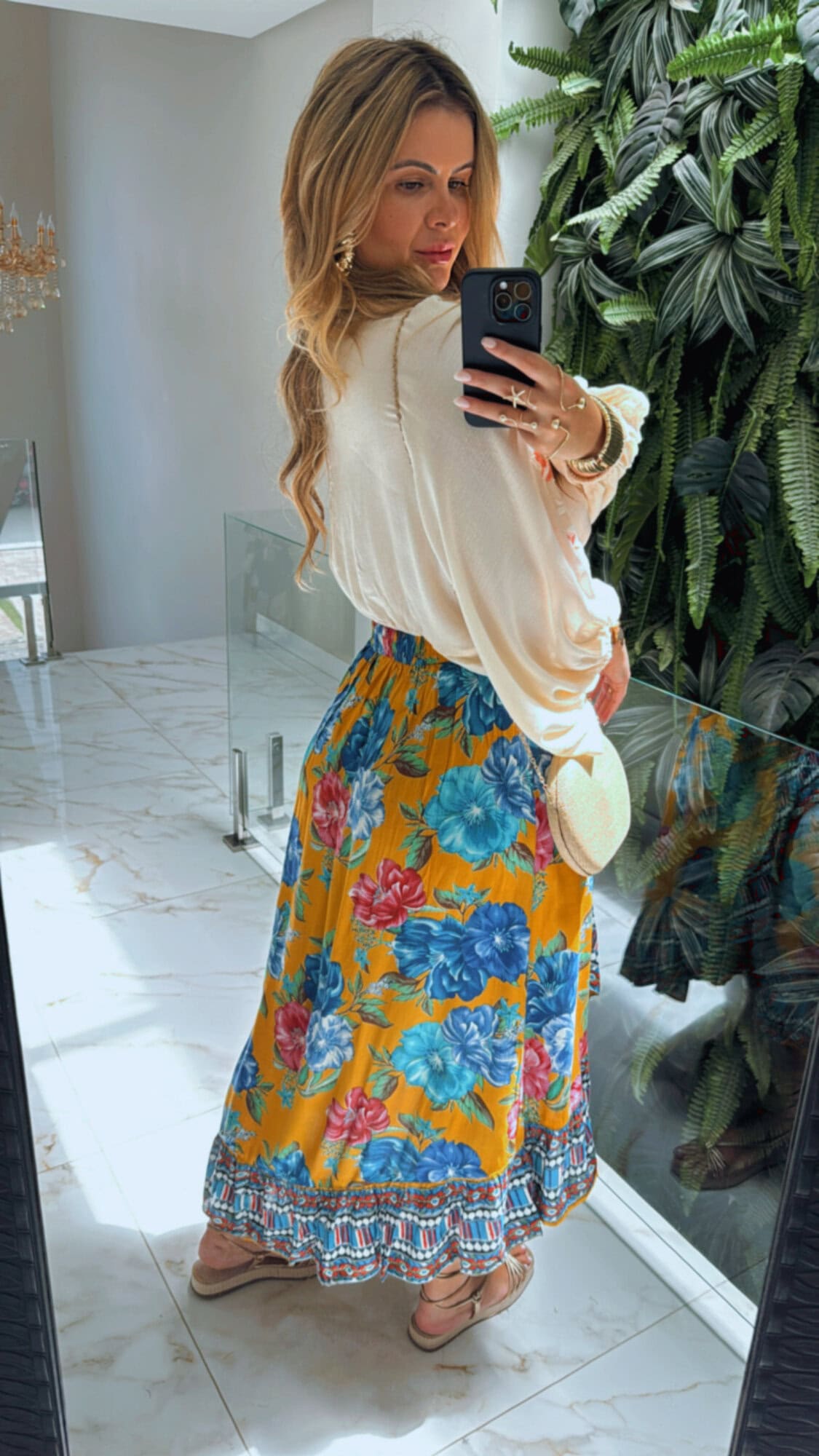 Saia estampada transpassada com lastex na cintura.