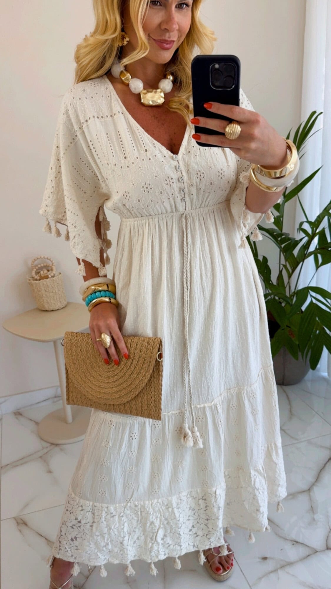 Vestido longo com elástico na cintura e botões no busto, possui bolso