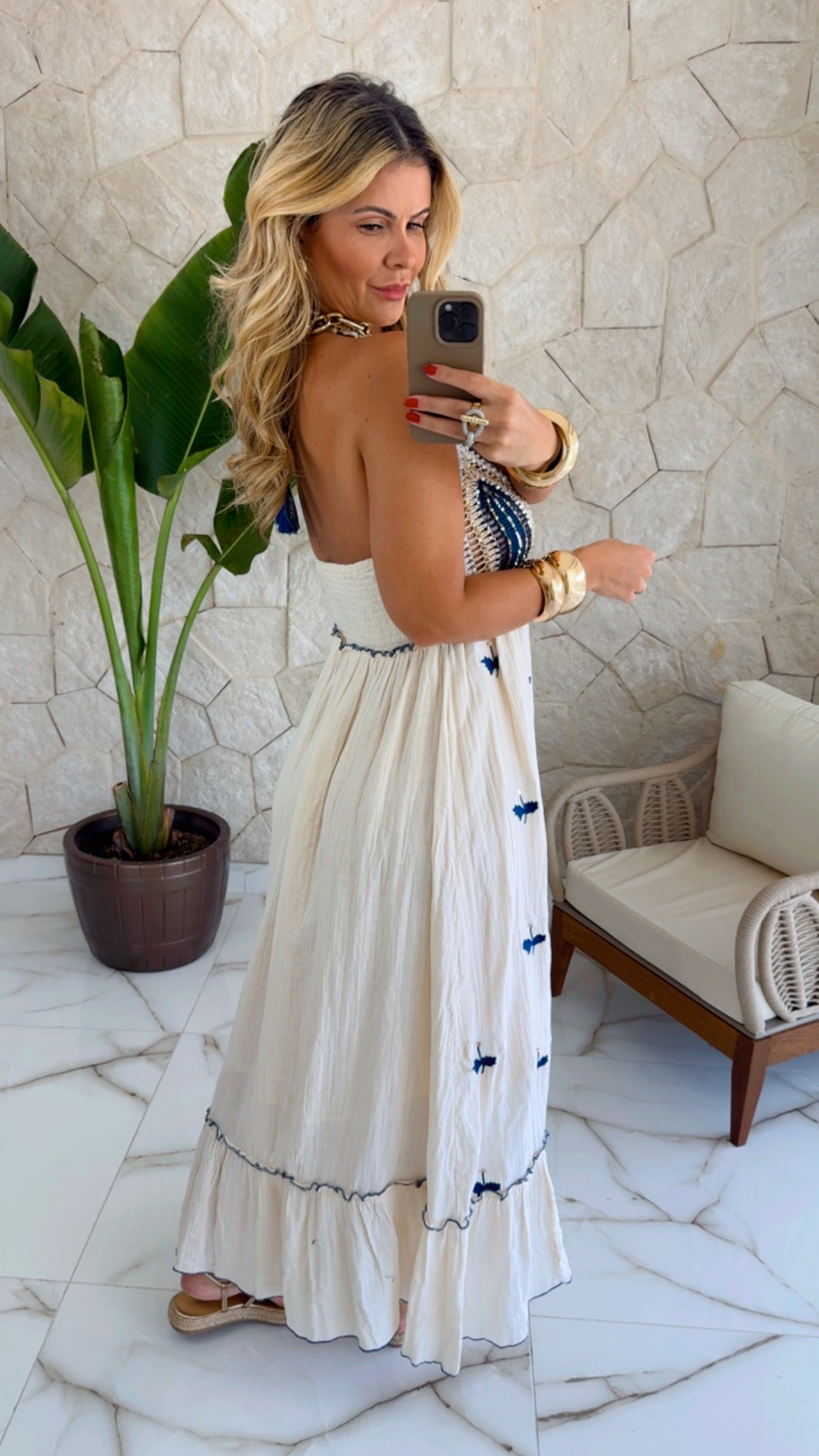 Vestido longo com crochê no busto e lástex nas costas