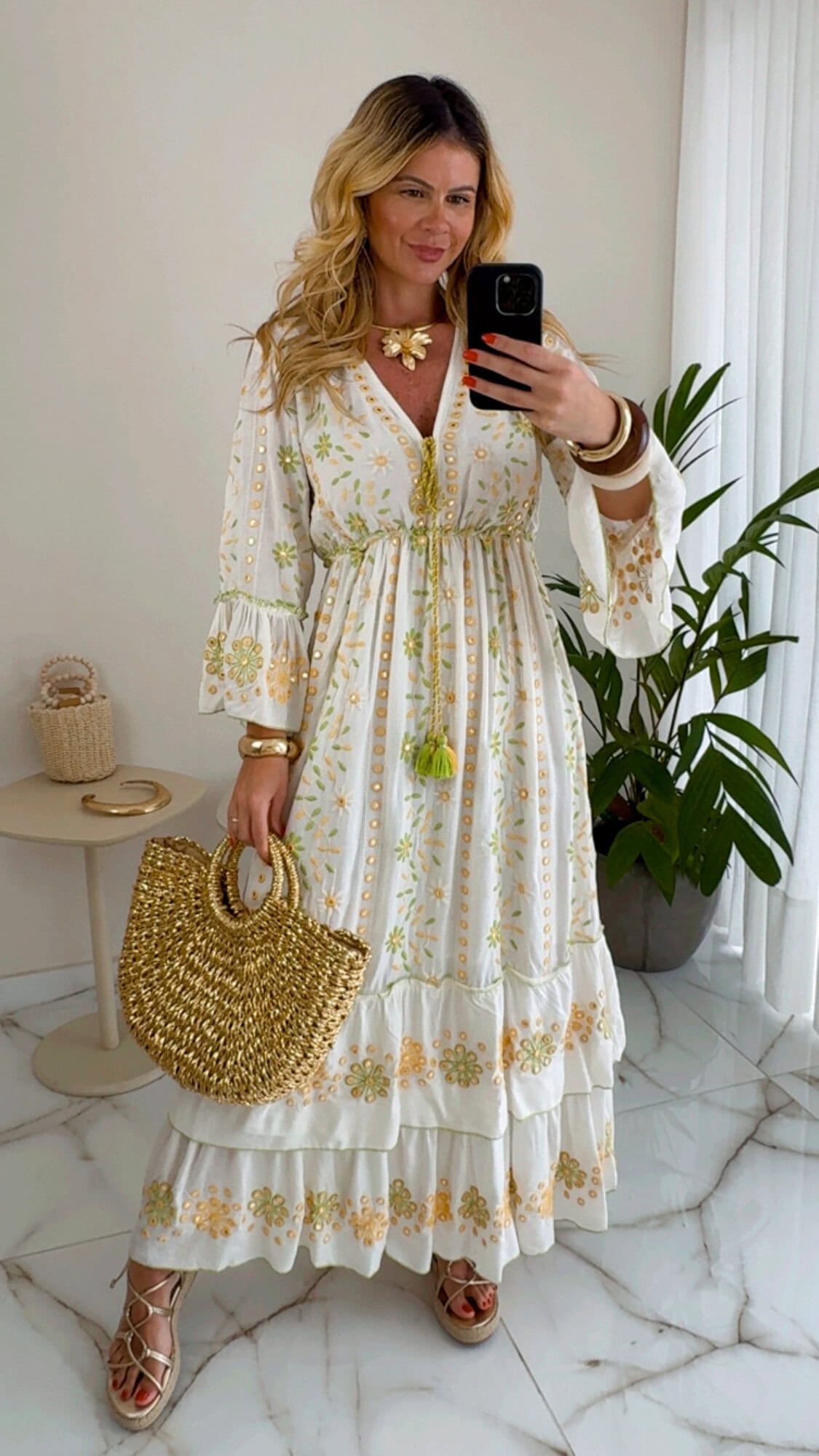 Vestido longo bordado com elástico na cintura