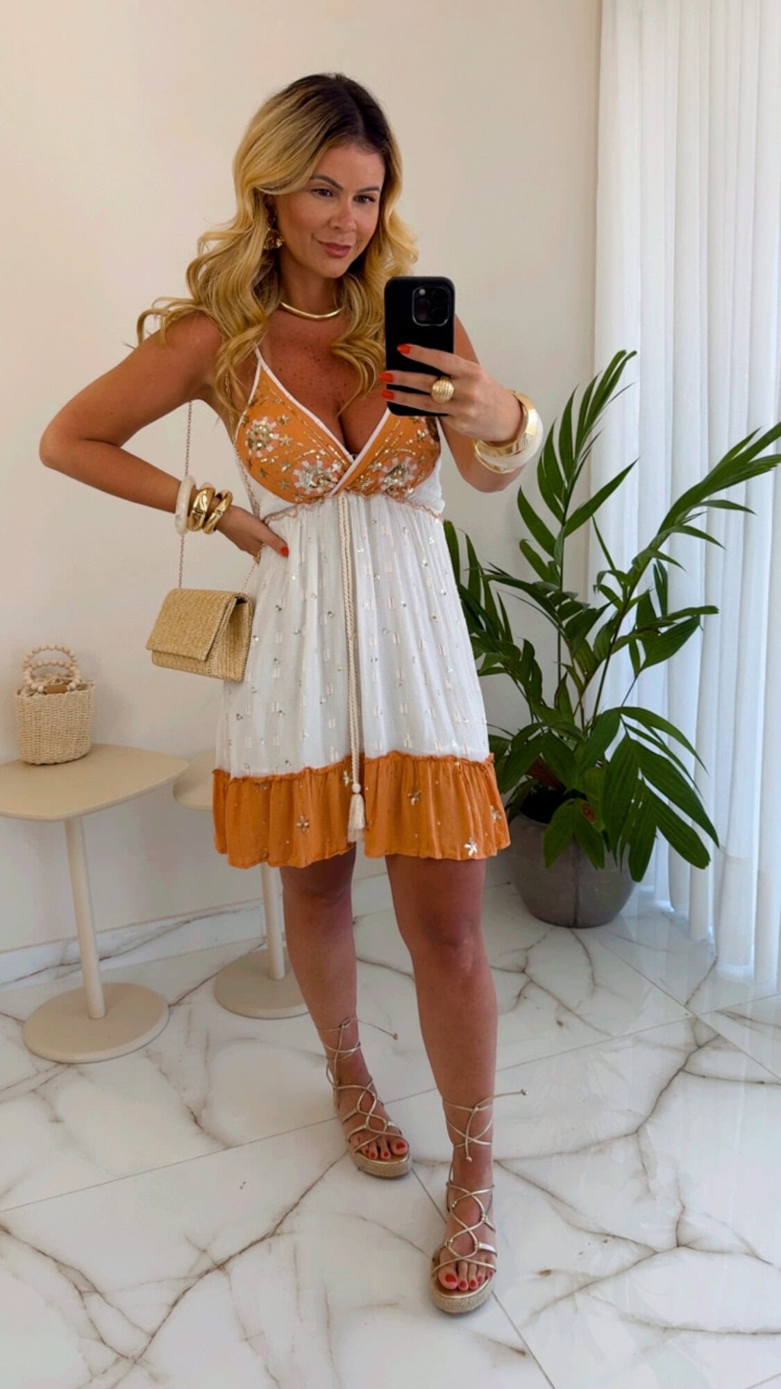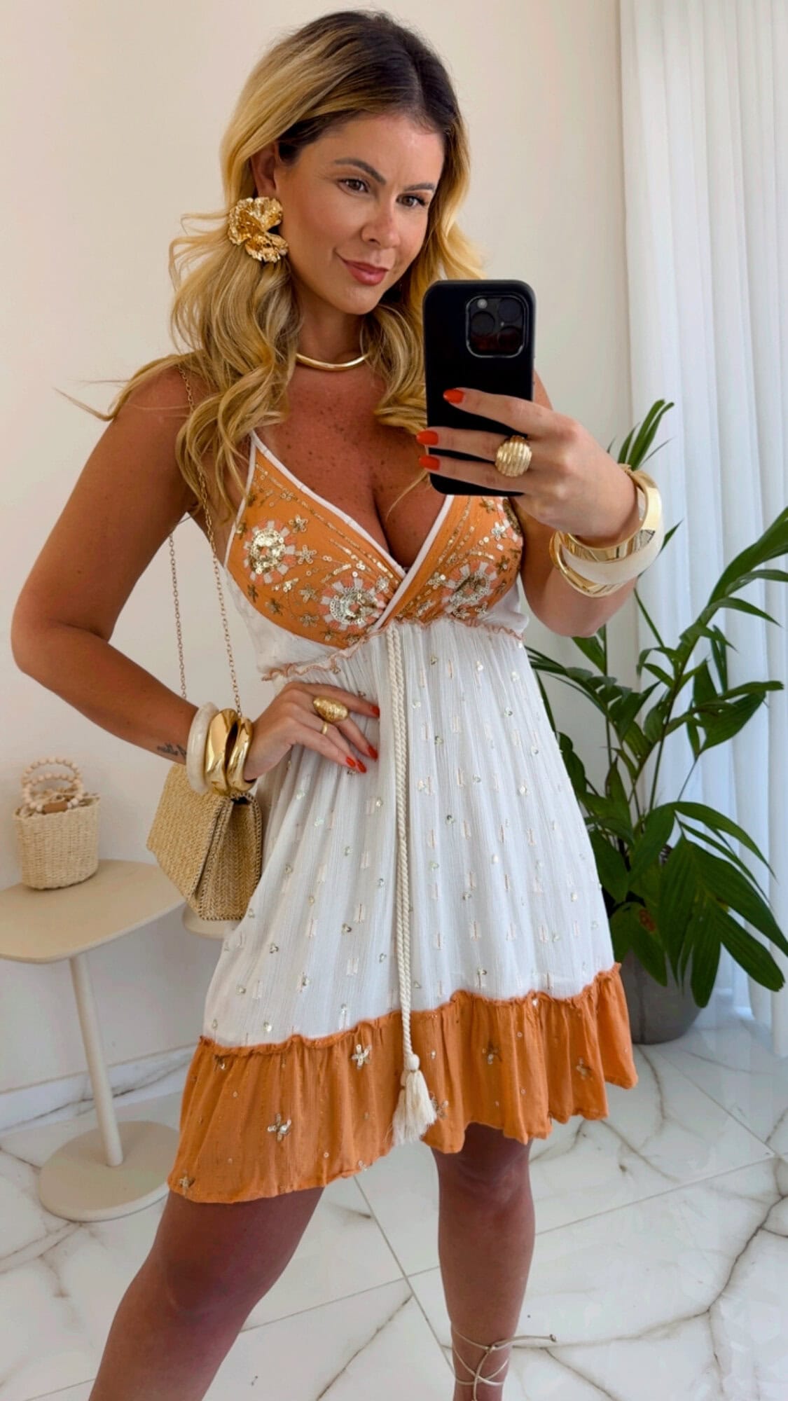 Vestido curto com bordados no busto, lastex nas costas e regulagem na alça.