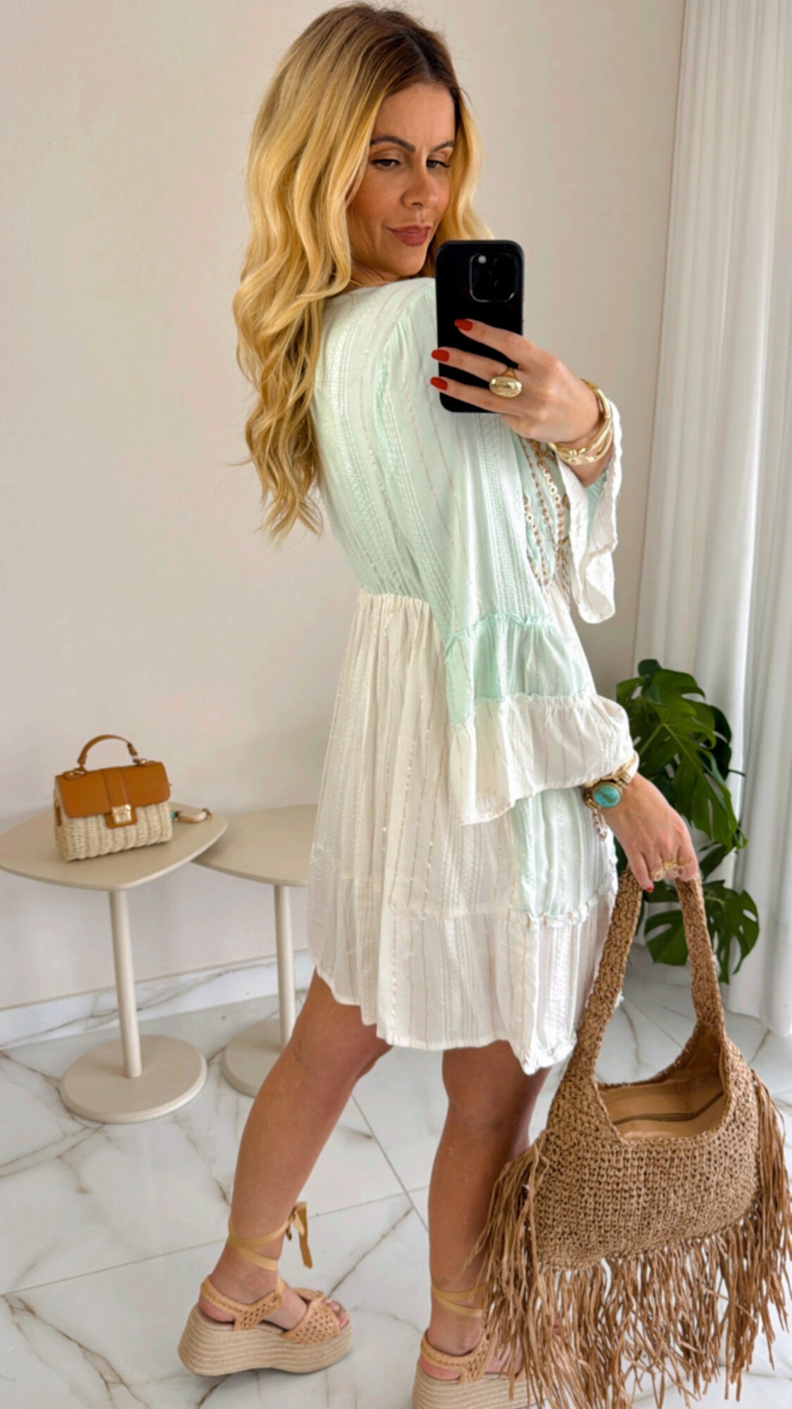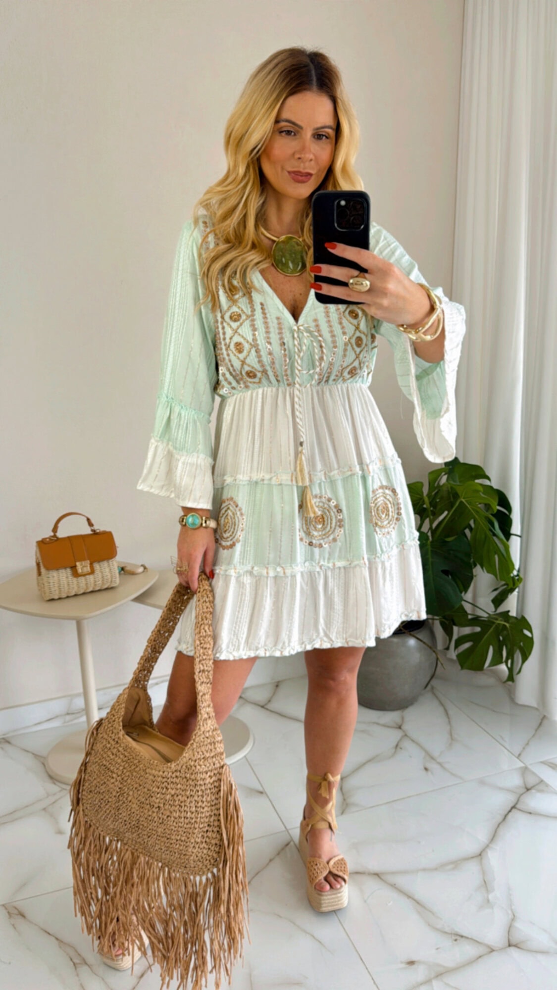 Vestido curto de manga longa com elástico na cintura, e detalhes de pedrarias no busto.