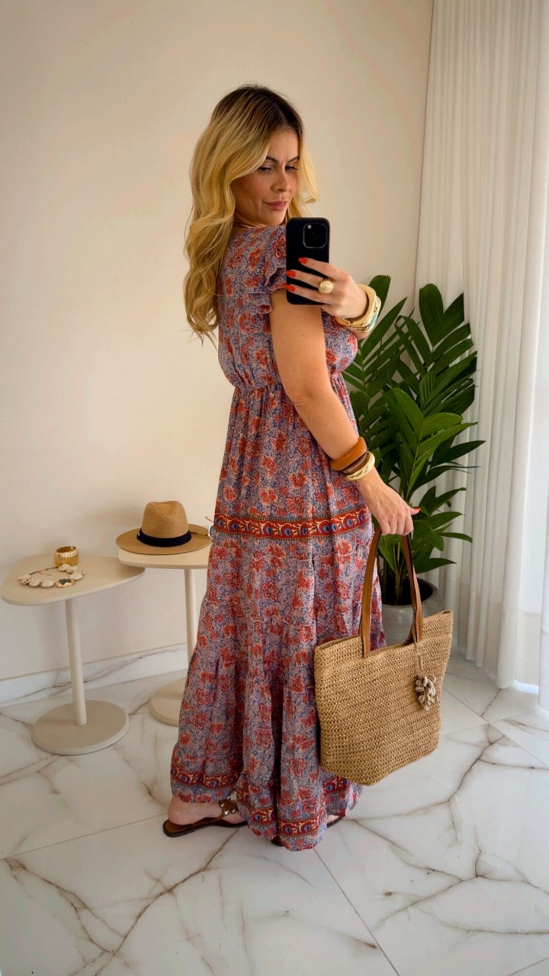 Vestido longo estampado com elástico na cintura