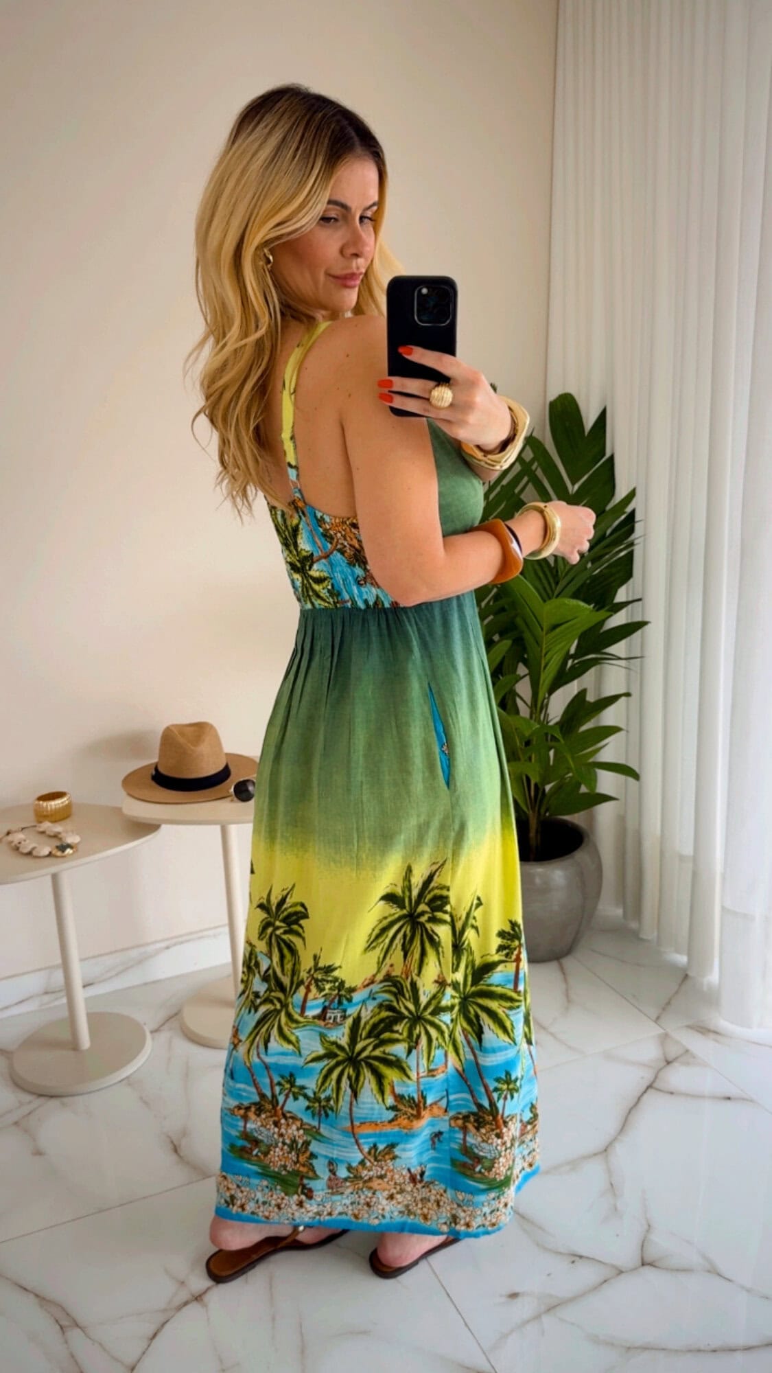 Vestido longo estampado com lástex nas costas e ajuste na alça.