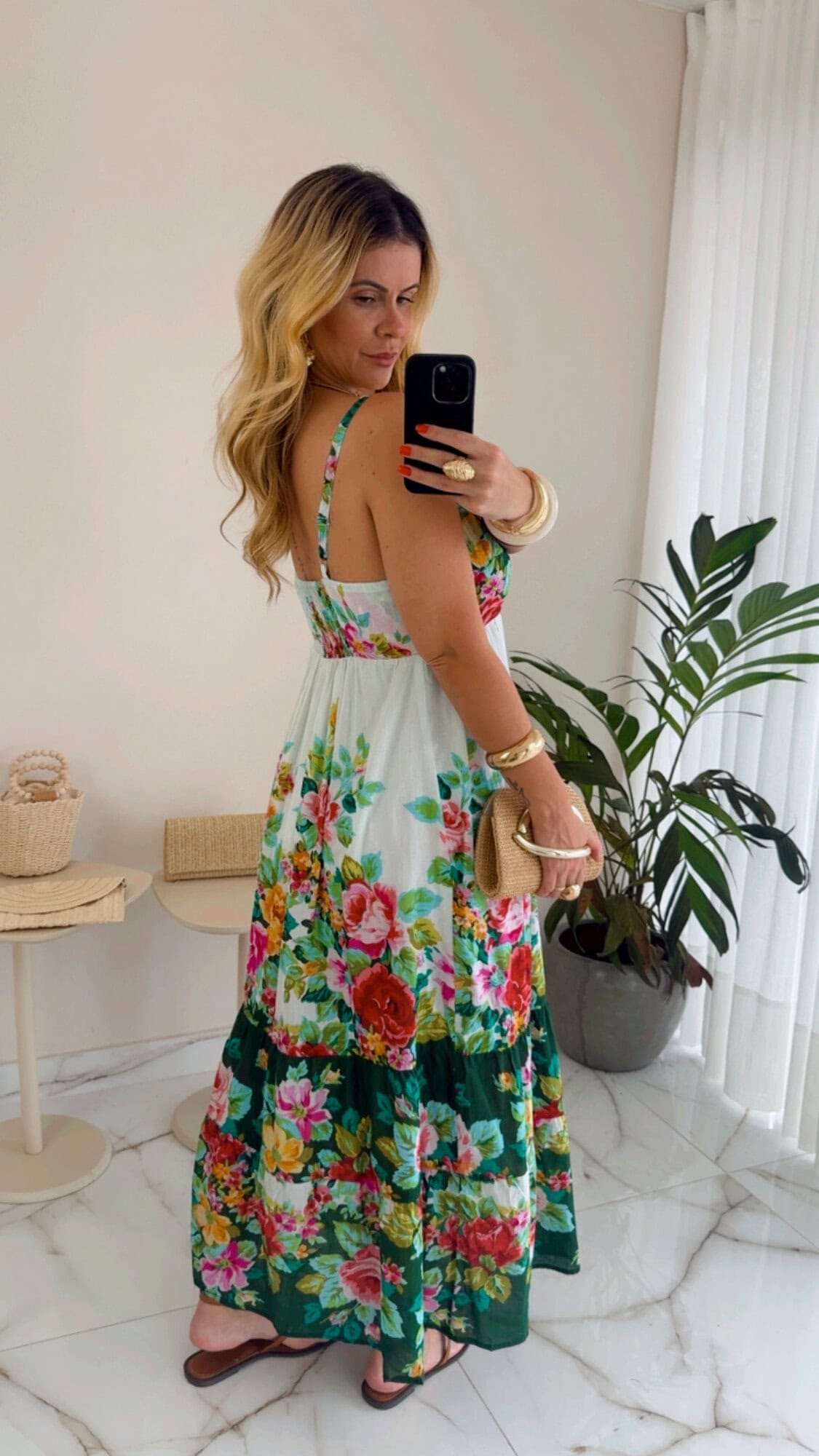 Vestido longo estampado com lastex nas costas, com pedrarias no busto
