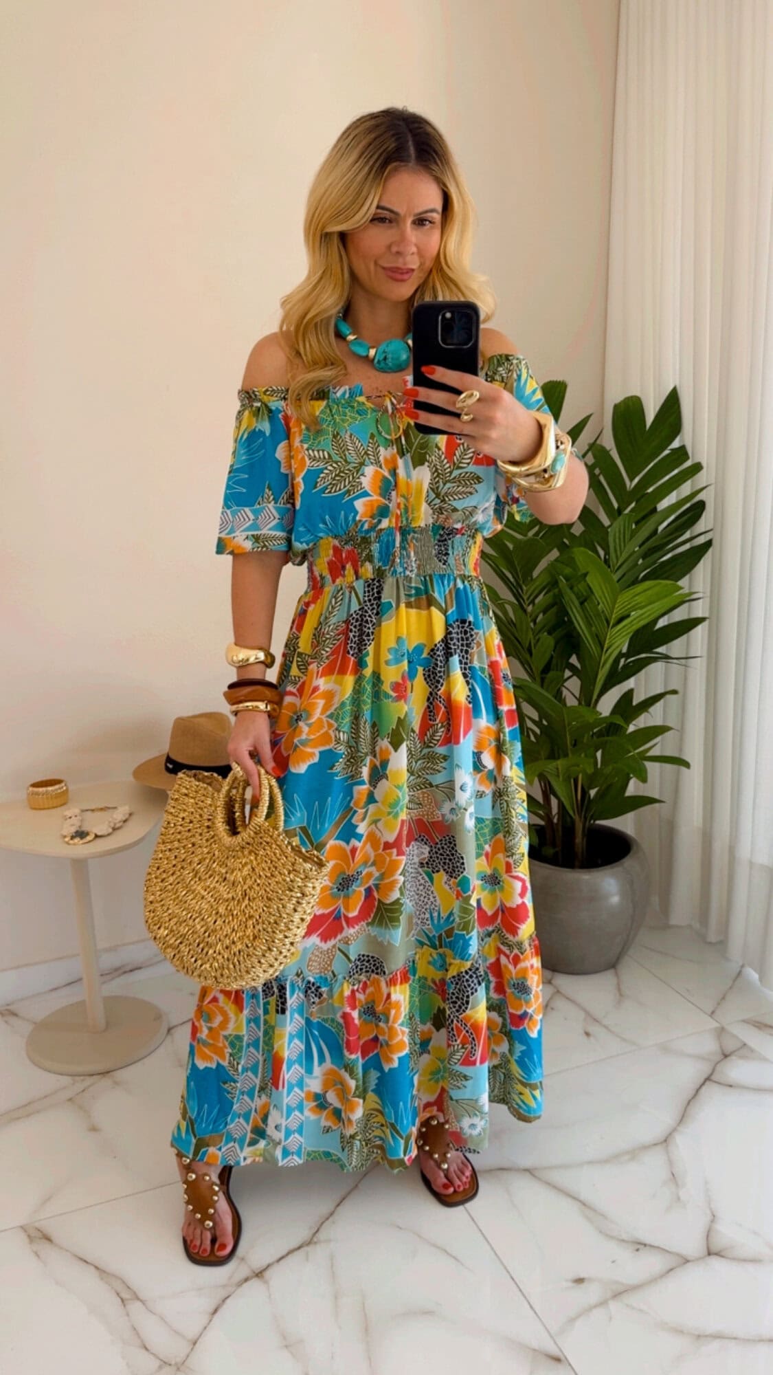 Vestido longo estampado com lástex na cintura