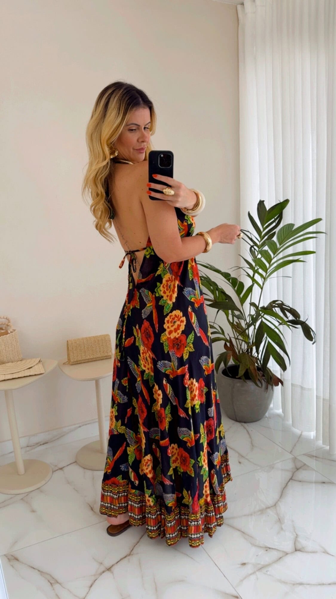 Vestido longo estampado com amarração das alças.