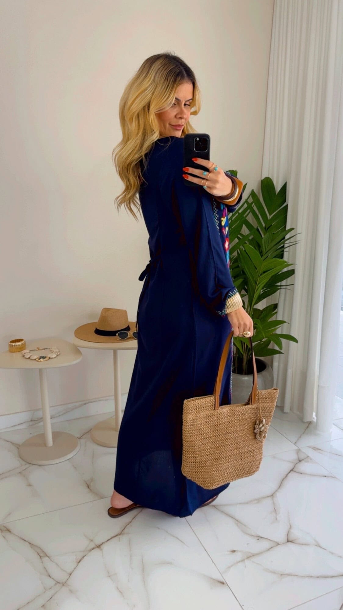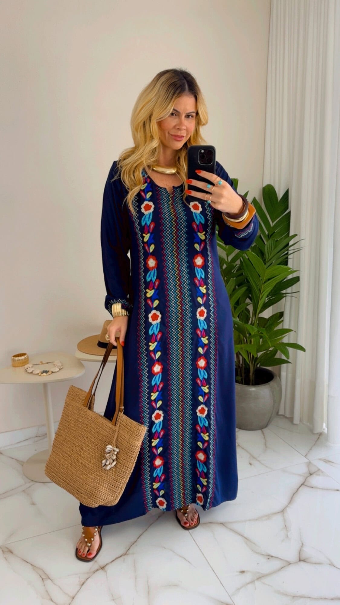 Vestido longo, manga longa com bordados e ajuste nas costas.