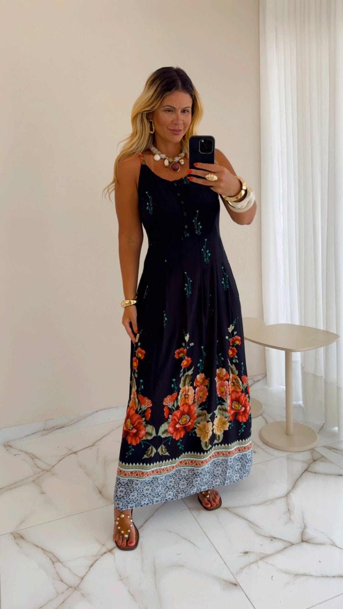 Vestido longo estampado com lástex nas costas e ajuste na alça, possui botões no busto.