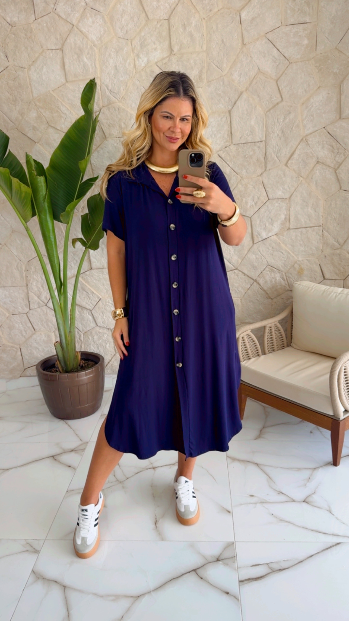 Vestido midi de manga e botões