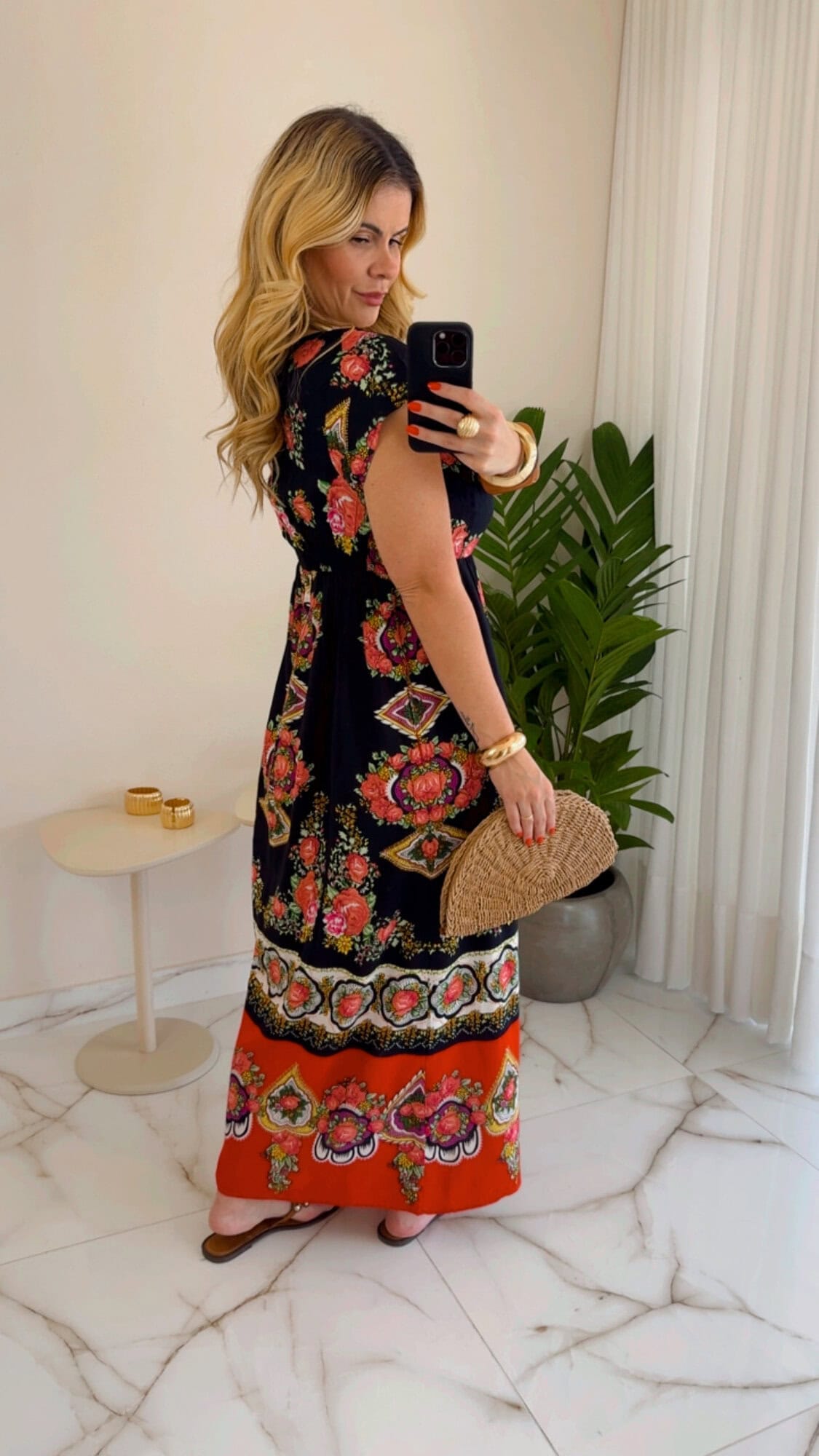 Vestido longo estampado com lastex nas costas e botões no busto.