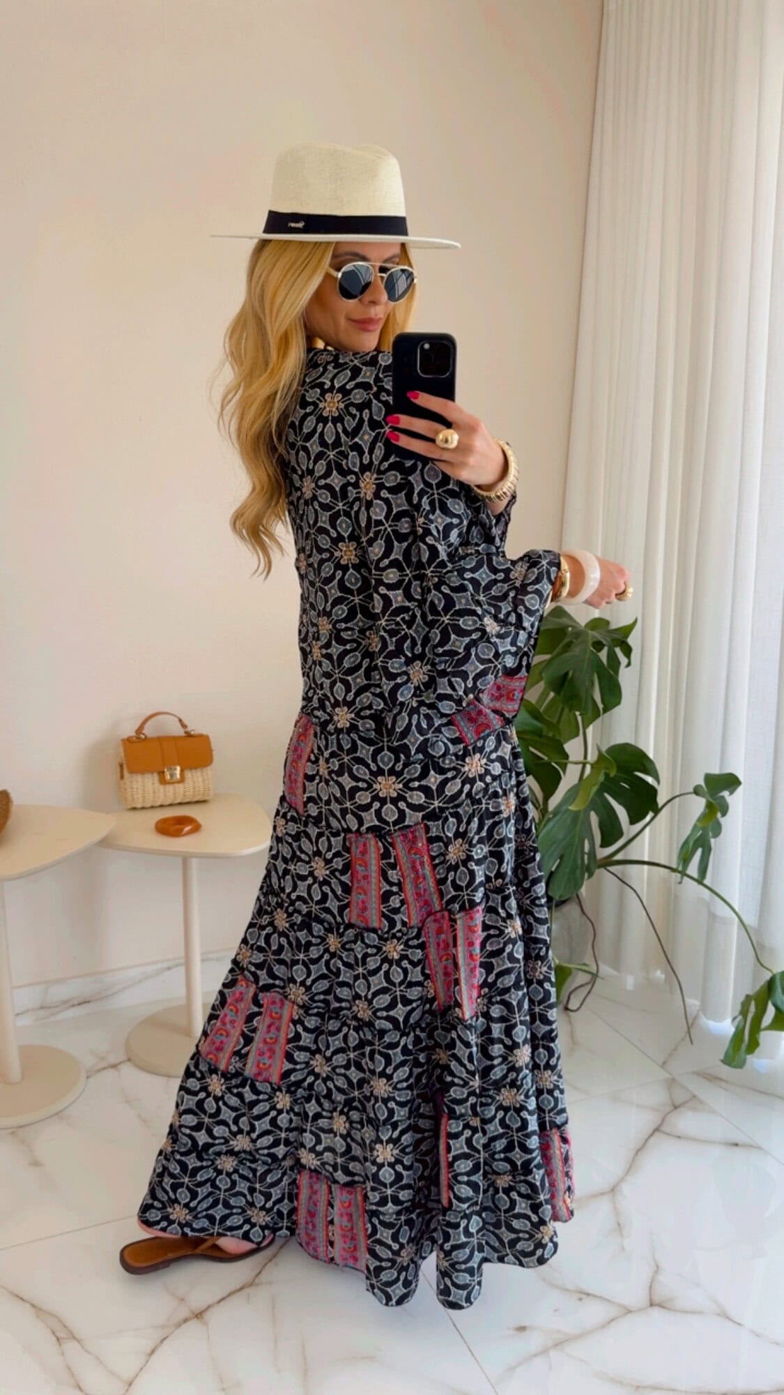 Vestido longo amplo estampado com botão no busto.