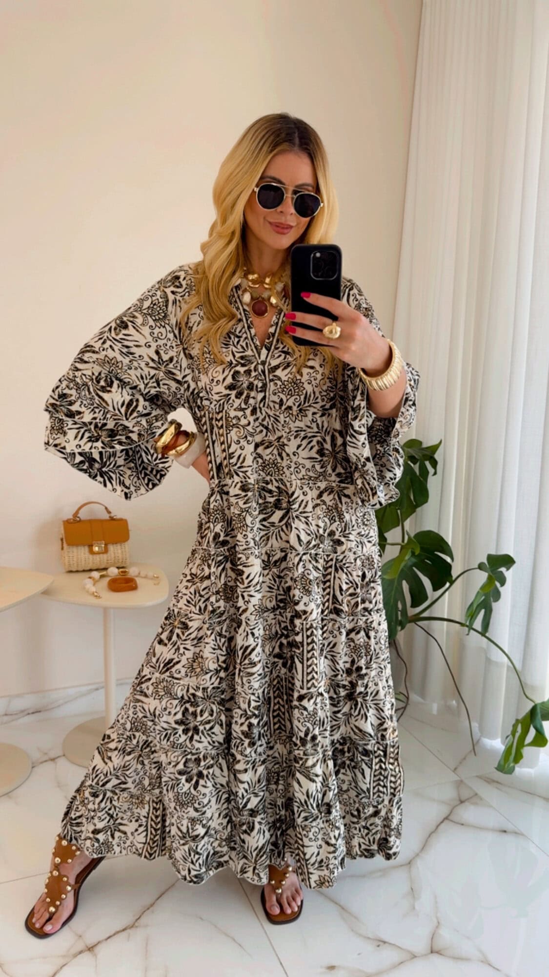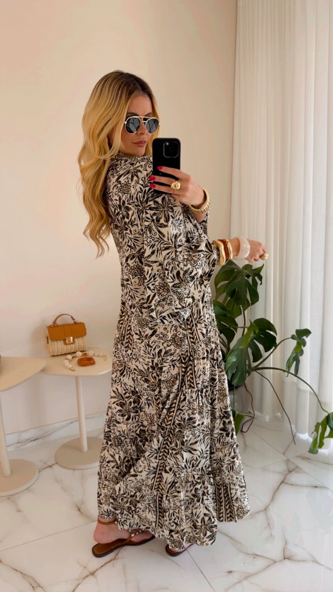 Vestido longo amplo estampado com botão no busto.