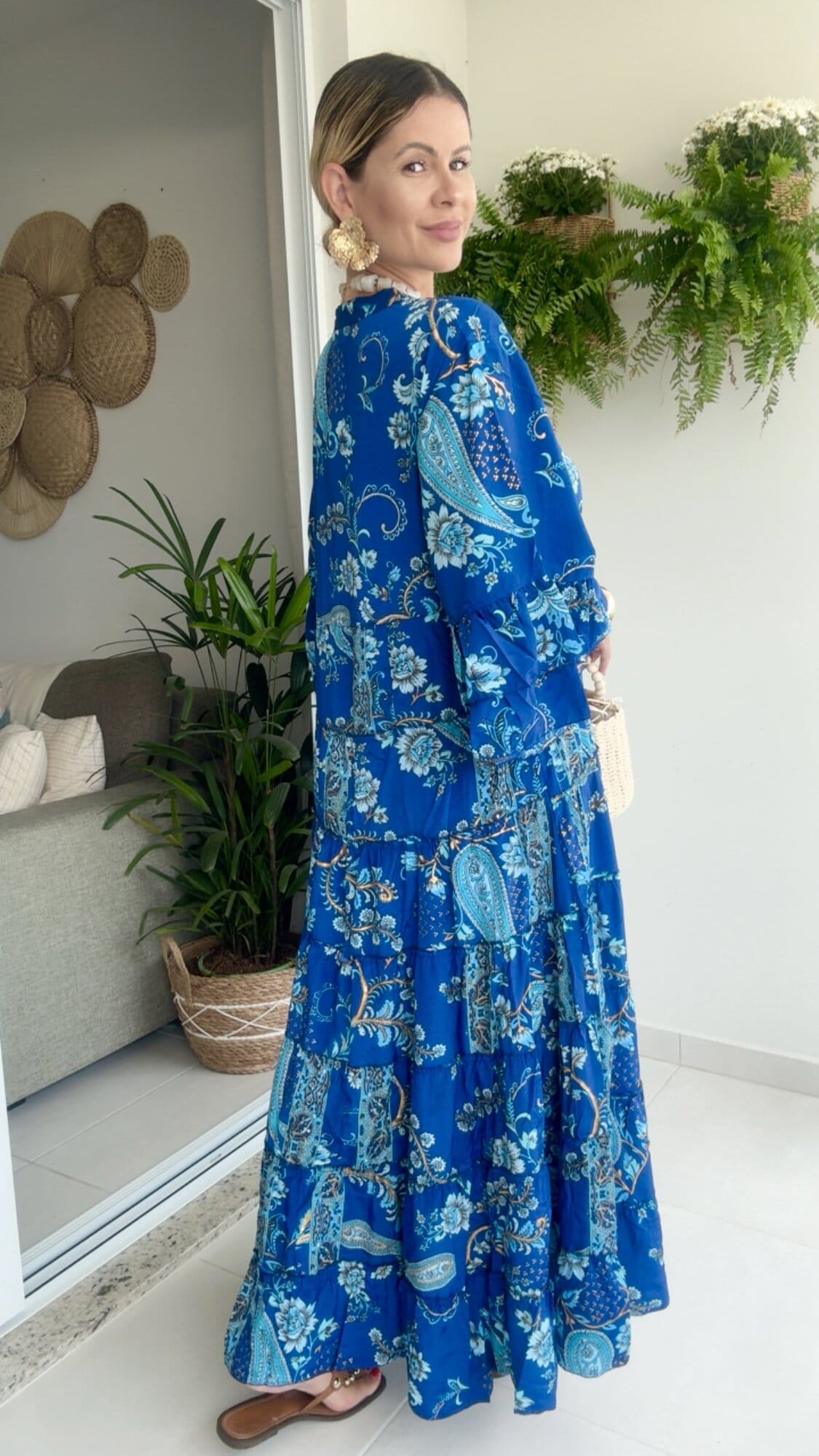 Vestido longo amplo estampado com botão no busto.