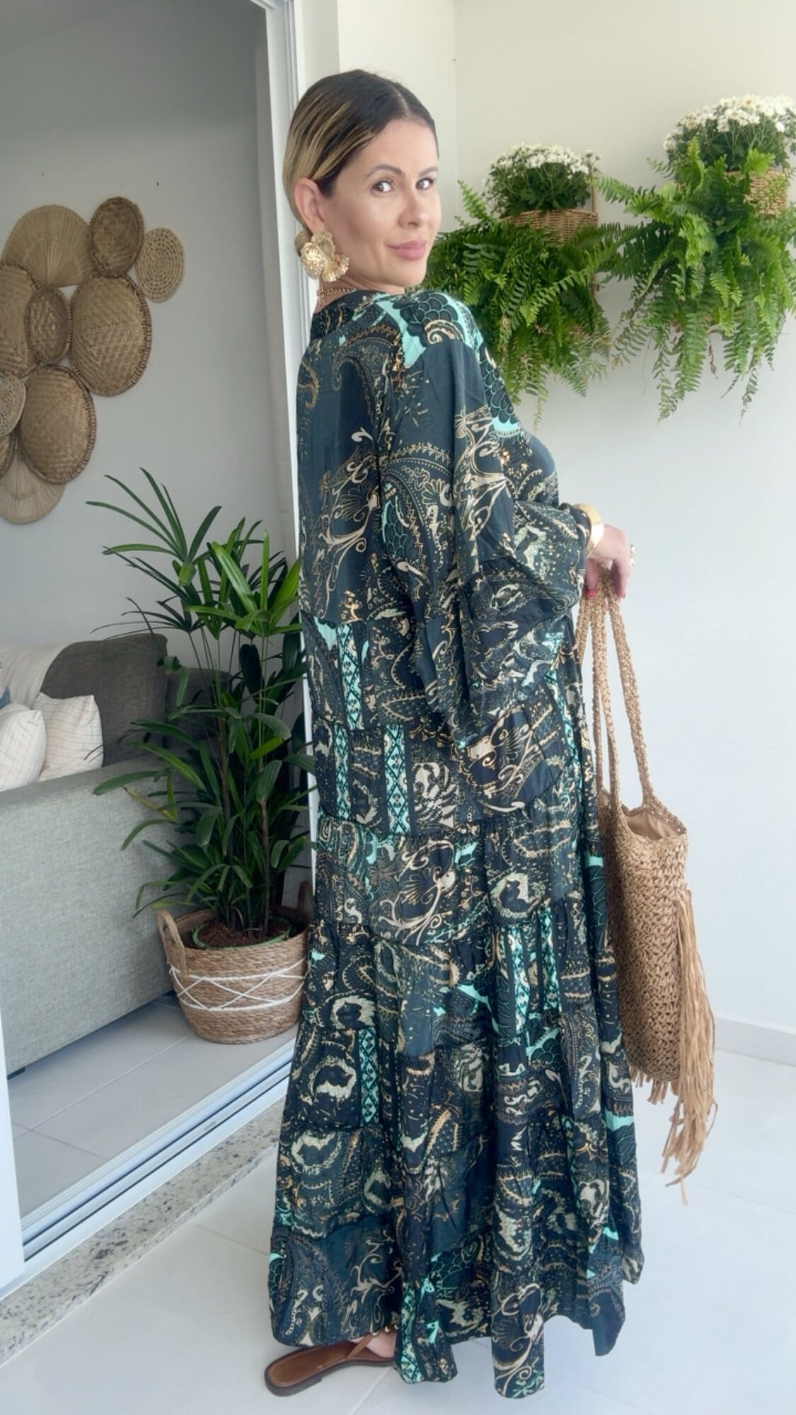 Vestido longo amplo estampado com botão no busto.