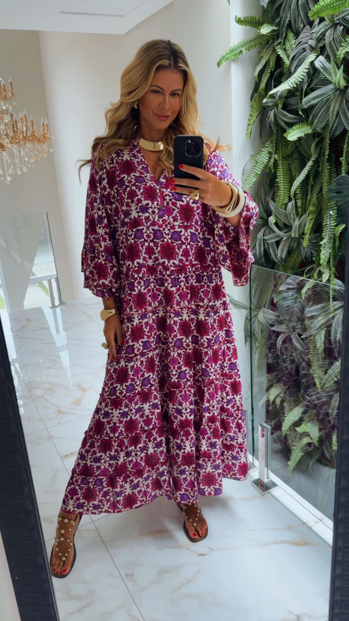 Vestido longo amplo estampado com botão no busto.